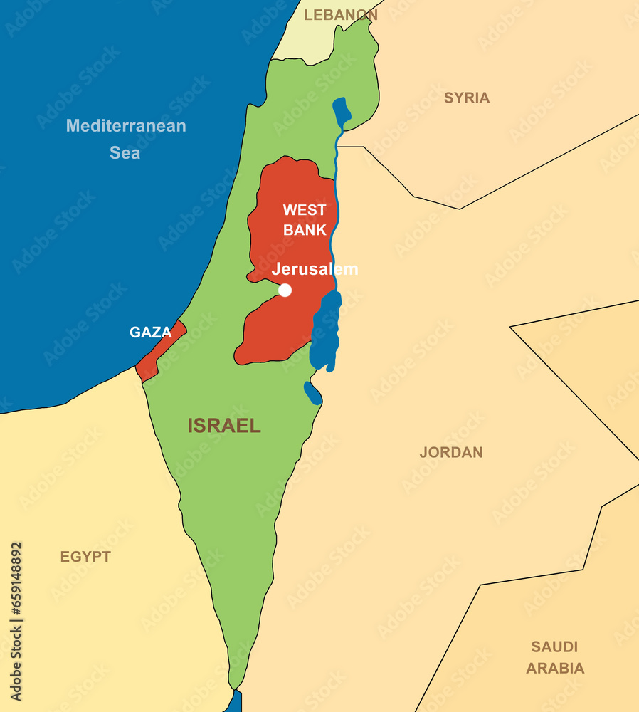 Israel on outline map, Middle East with Egypt, Syria, Lebanon